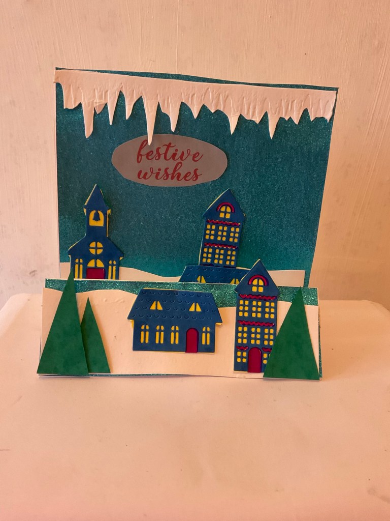 For the decoration, I used an embossing folder for the icicles and the snow drifts, and dies for the buildings. To add lights inside the buildings, I drew around each die cut onto yellow card, cut it out and glued each piece to the backs of the buildings.