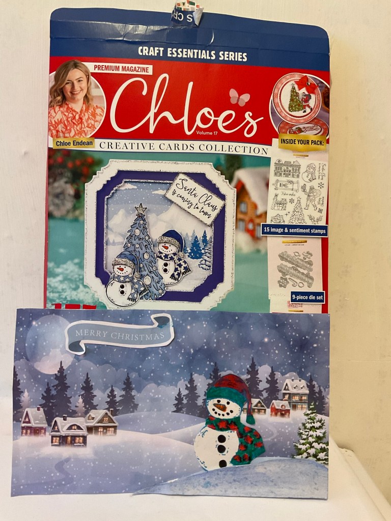 Hi everyone. Today’s project is from box 17 of Chloe’s Creative cards. All of the elements are from the box set. The card and patterned paper measure 8×4.1/2 inches. I made the raised snow hill at the front of the card by drawing a simple shape onto white card, and using watercolours to blend it into the colour scheme of the card. The snowman was part of the stamp set from the kit and I coloured him with alcohol markers. Finally I added a sentiment which was part of the paper pack inside of the magazine. This is a beautiful set and I’ll be doing another project from this kit on Friday, so I hope you can join me for that.