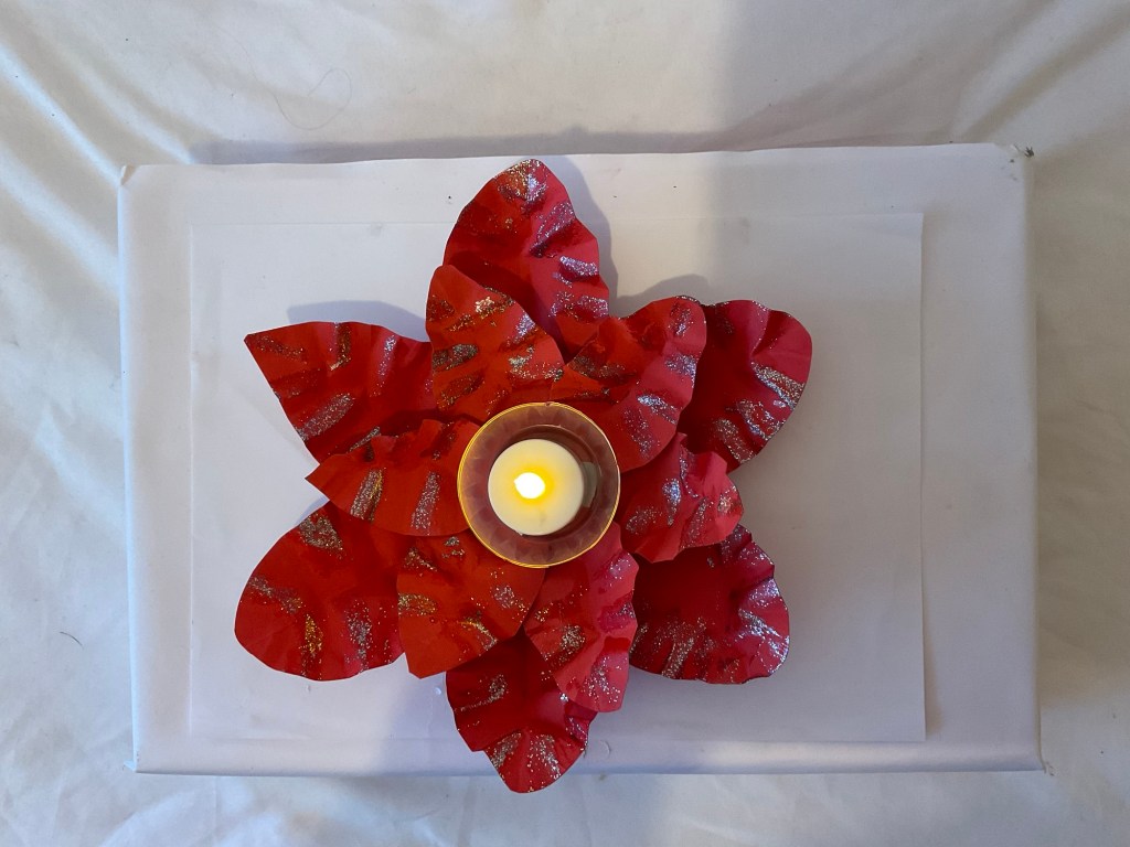 The tub for the tea light candle is a cut down plastic trifle tub. Make sure you use battery tea lights for this for safety reasons. I attached the plastic tub to the centre of the flower with a strip of foam tape. (Hot glue won’t work for this.)