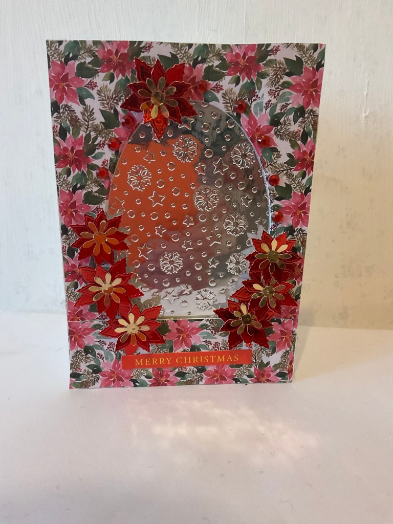 Hi everyone. I have completed my final three projects for this Christmas, and I thought I’d share them with you here and tell you a bit about them. The picture above shows the card I made today, and that is a poinsettia card. It’s a 6×4 card and the inspiration came from the embossing folder. It’s actually a snow image, but if you embossing it onto different coloured card, those snowflakes could easily be interpreted as flowers. I chose poinsettias because I had this beautiful paper in my stash and wanted to use it. I used an oval die that measures 4 x 1.1/2 inches and added a banner that measures 4 x 1.1/2 inches at the bottom. The flowers are made from dies and mirror card to add a bit of shine. I love the way that this card has turned out.