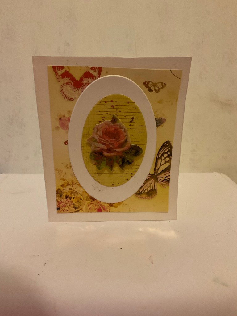 The large oval die measures 2.3/4 x 4 inches and the small oval die measures 2 x 3 inches. Again, if you’d like this border to be narrower, cut a slightly bigger oval. Perhaps 2.1/2 x 3.1/2 inches. This type of card can be made in any size and with any combination of shapes and Matt sizes. Raid your dies and papers and see what you come up with.