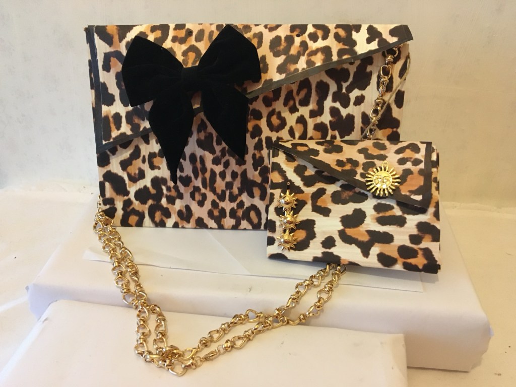 Hi everyone. A client of mine is starting her own paper boutique and she’s commissioned me to make some paper handbags with purses to go inside. This is the first one that I’ve made for her. The bow is a velvet hair clip, and it acts as a weight to keep the flap down, although there is a square of Velcro on the underside to keep it in place. The chain is made from two identical necklaces which I’ve linked together with a jump ring. The three sun embellishment on the purse is a hair slide. I put it there to cover up the holes where the ribbon went through. The original bag was an ordinary paper gift bag which I cut down to make the bag that I wanted for this project. It was fun to make and my client loves it and had asked me to do more in different designs.