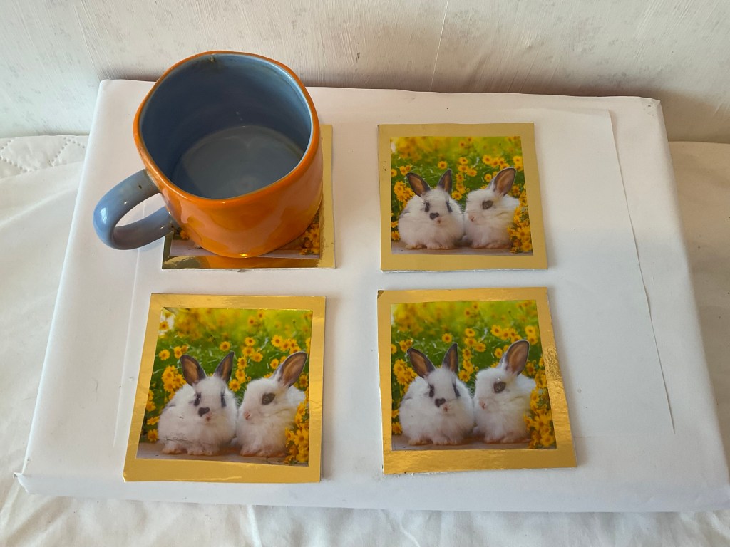 I used rabbits on this sample set that I made, but any animal can be used to make these drinks coasters. You can even email me a photo of your pets, and I can make a set up just for you. As soon as I can, I’m going to add a video to this page that will show you how to make your own drinks coasters, if you wish. Many crafters like making their own products, so I’ll have that video done just as soon as I can.