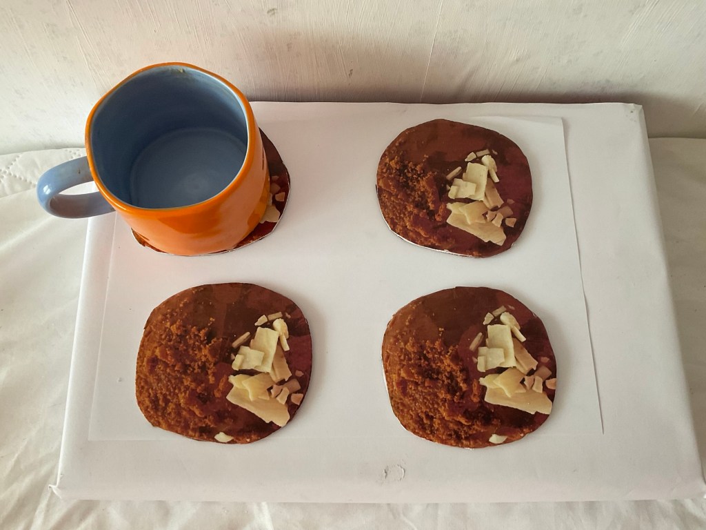 This is the latest in my coaster designs. It’s a muffin coaster and I made it by taking a photo of the top of a muffin, resizing the image and cutting it out to a diameter of 3 inches. The surround is a four inch gold mirror card and the base is a piece of mount board. Once they were all glued together, I sealed the top of each coaster with a coat of mod podge. You can also use PVA glue for this as it will go clear once dry. These food inspired coasters are perfect to have out during a party or any social occasion.
