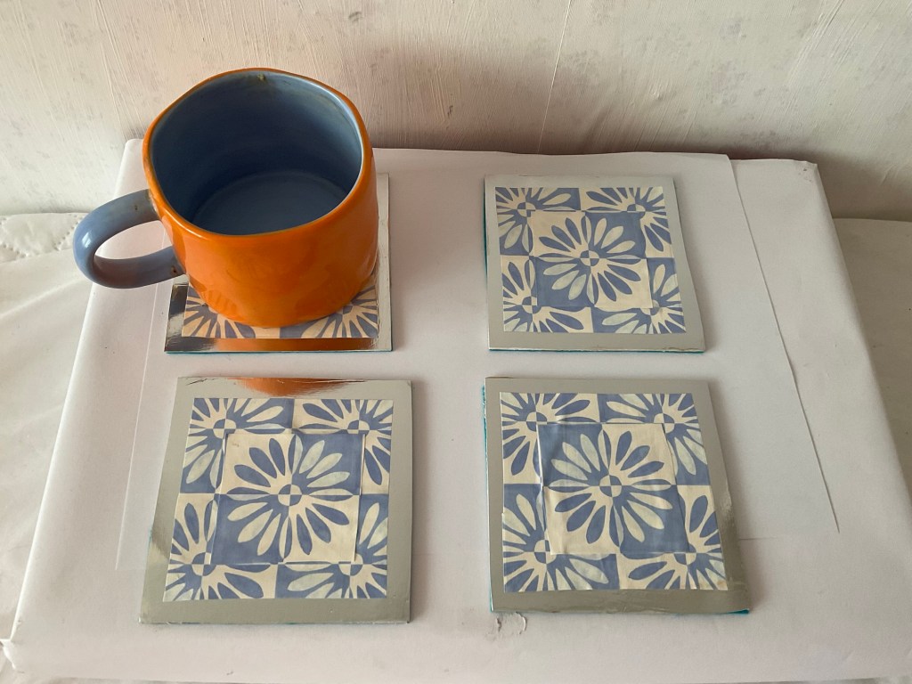 These were actually made from a sheet of wrapping paper. I cut them to size, mounted them onto a board and sealed them with a waterproof resin. They have a sheet of felt on the back. Great to have around the home to avoid those coffee stains on your best table.