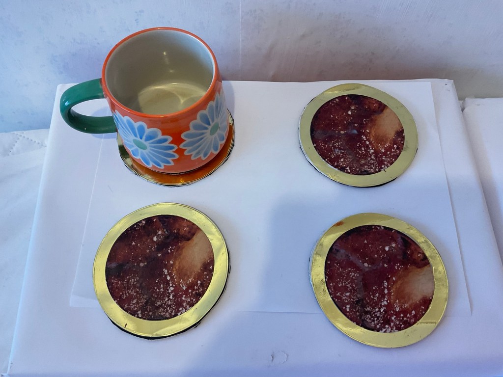 These are so much fun to make. I photographed a real doughnut for the image. Then I resized the image and printed it out four times. I glued it to a sheet of board, cut each one out and then glazed them all with a waterproof resin. I added felt to the back. These can be easily cleaned by wiping the top with a damp cloth. They shouldn’t be submerged in water or placed in a dishwasher. They are great for parties when you don’t want your tables to be spoiled with coffee or tea rings. Just make sure your guests don’t try to eat them. I know that sounds silly, but a customer told me that actually happened. She had ordered a set of these coasters to use at a party and one of the guests picked one up and tried to eat it. Thankfully the person wasn’t hurt. Maybe I’ll make the next batch with a gold rim around it to make it look more like a coaster.