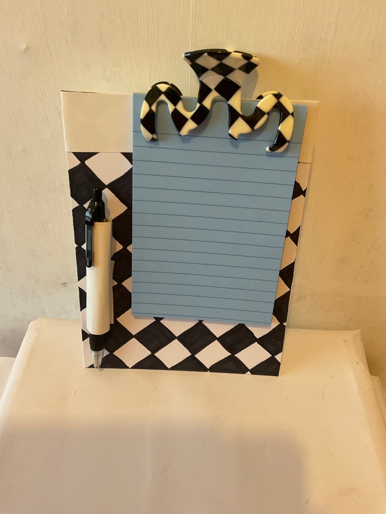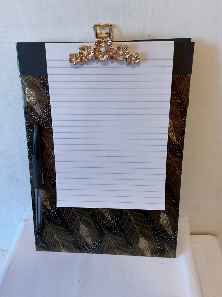 This is the first clipboard from my paper boutique collection. It is made with high end paper with shimmer and style. The clip is also a designer clip that looks very elegant. As with all of my clipboards, I’ve added a pen loop. They are not sold with a pen included, but they are supplied with a stack of paper.