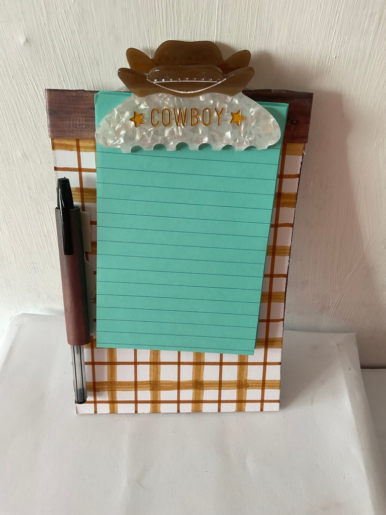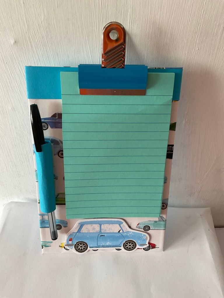 This was a special request from a customer, but it was so popular that I decided to keep it as part of this range of items. I painted the checked pattern and adapted the clip to suit the style of this board. The pen loop is a handy addition to any clipboard.
