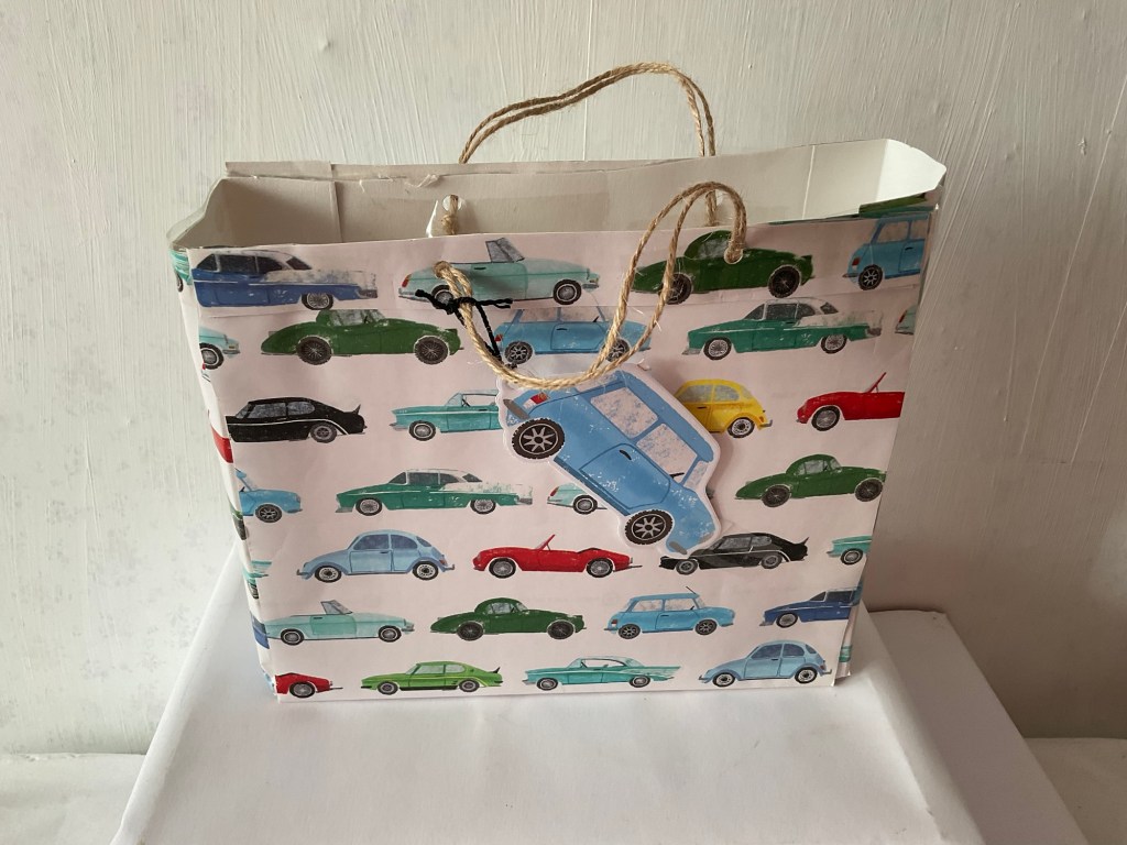 This is the first of my gift bags for men, and there will be more as soon as they are completed. I enjoyed making this and adding the car image for a gift tag felt like the perfect finishing touch. The jute handles keeps the simplicity of the design.