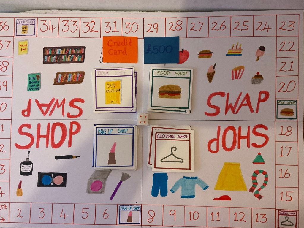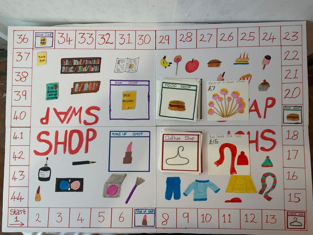 Hi everyone. This is the latest stage of my new shopping game, called Shop and Swap. I’ve finished the shop cards, made the dice and the credit cards. I added in the extra items to the board to give you an idea of what they look like. So when I come back tomorrow, I’ll have made the counters and I’ll show you a game in progress. So do pop back and see the finished game tomorrow. 🌅