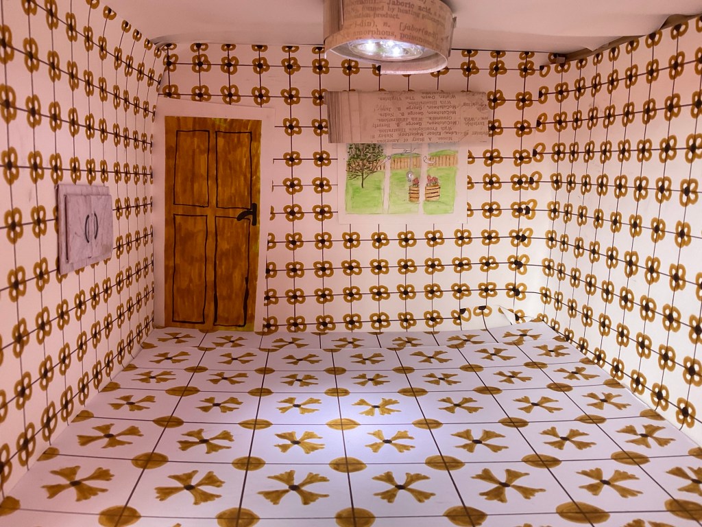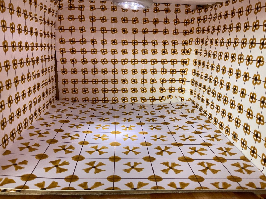 Once the floor is added, it really starts to look like a room. I used white mount board for the floor and painted the pattern with alcohol markers, as I did for the walls. This took quite a long time, but it was very relaxing to do. Adding the window, window blind, door and serving hatch, and light fixture really made the room come to life.