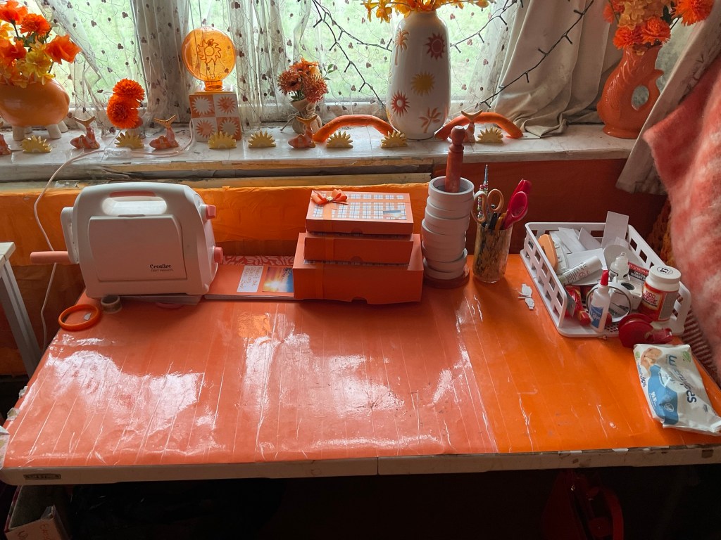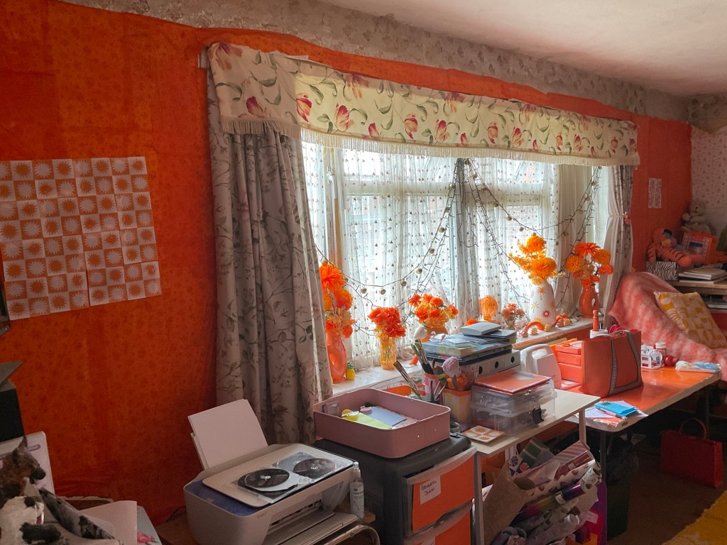 This is the desk where I work. It was originally a fold up camping table, but I covered the top with orange card and sealed it with waterproof tape so that I can wipe it down if it gets dirty. You can also see most of the window sill with my lovely orange vases and flowers. The little sun ornaments add a nice touch to the display, I think. The sunshine lamp in the centre of the display looks amazing at night when it’s dark, and the main lights in the room are turned off. It emits a radiant glow that bounces off of the orange wall opposite and makes that glow even brighter.