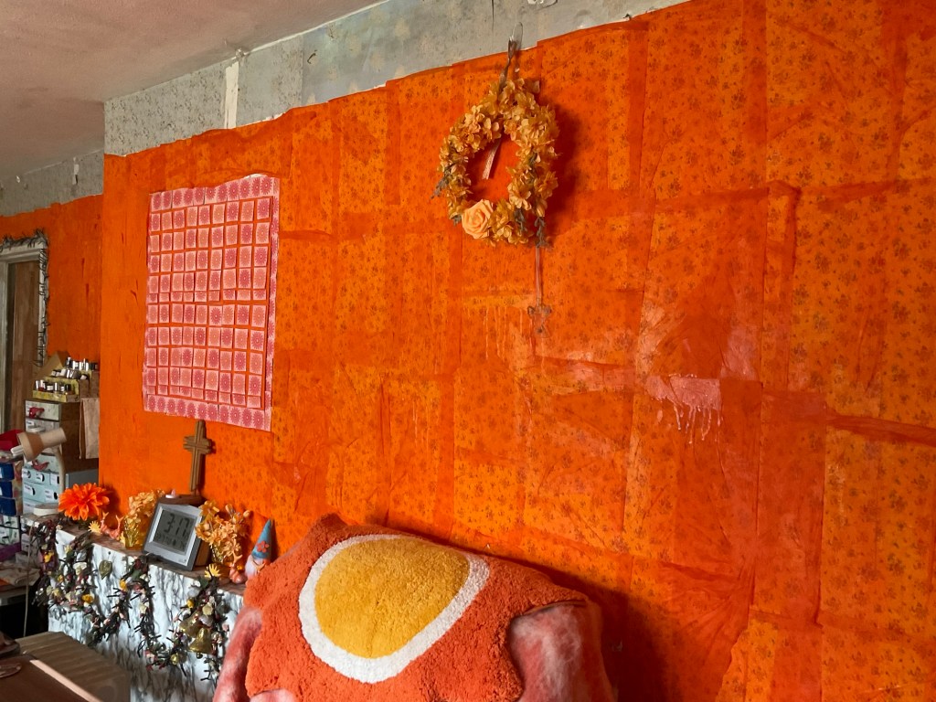 This is the wall opposite the window. I pasted my orange paper onto the wall so that the pattern from the original wallpaper still shows through a little bit. I’ve made a tiled section to break up the solid orange. You can also see a glimpse of the back of my chair. Again, I’ll give you a closer look at that later on.