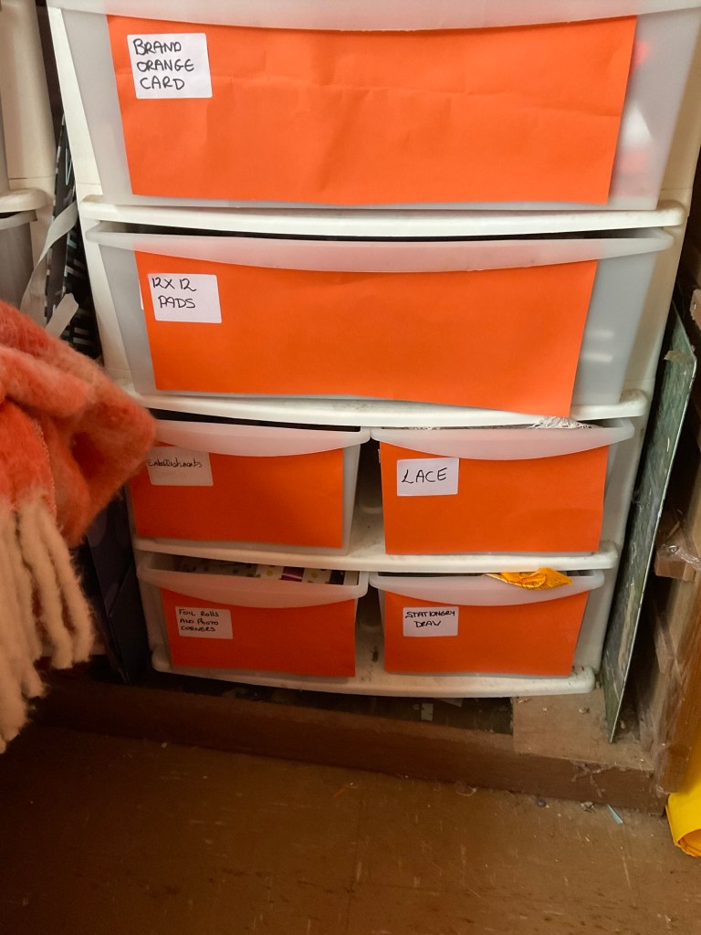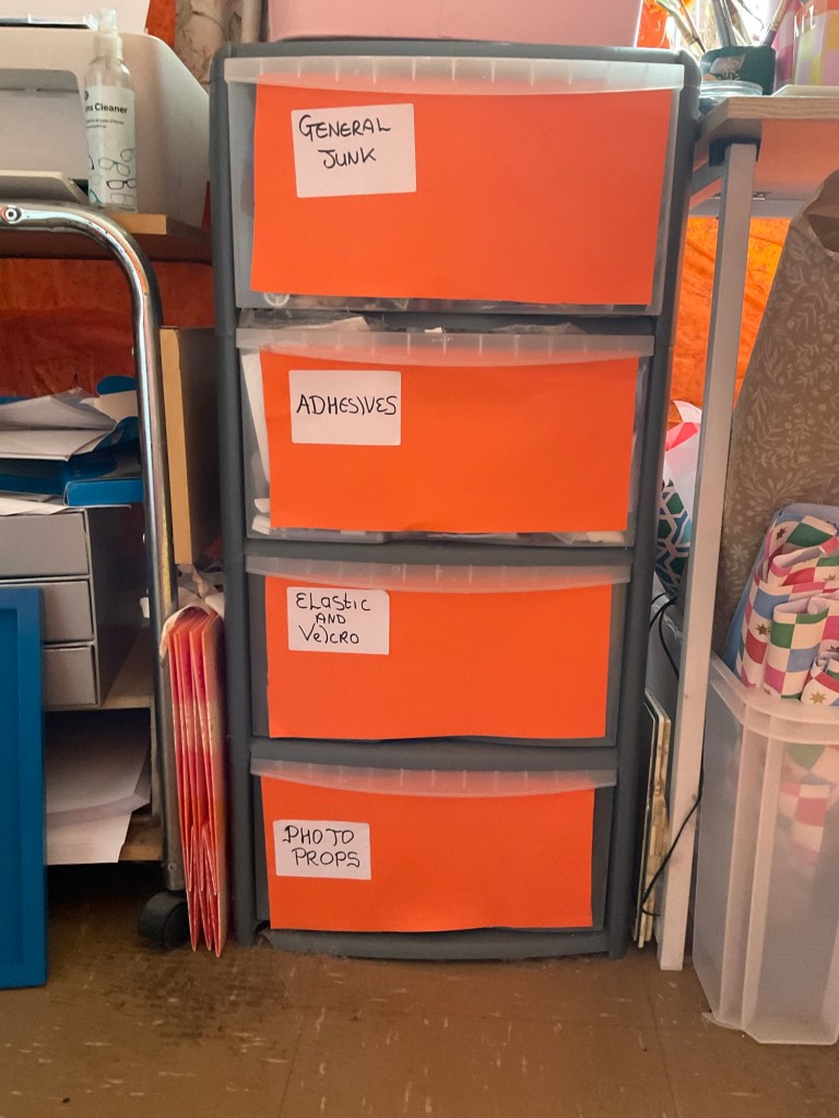 This is another set of plastic drawers that have been fronted with orange card. These are at the far end of the studio, and they sit under my workstation. There is another set next to it which is identical.