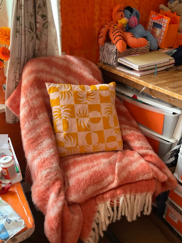 This is my armchair. It’s actually a deep maroon colour underneath, but the upholstery is starting to look a bit tatty so I bought an identical throw to the other chair and placed it on my armchair. It’s very cosy. The cover on the back of the chair is actually a bath mat, but I thought it would look better in my studio as the orange sun is my logo, so I added it to the back of the chair. I love it and it’s very soft to rest against.