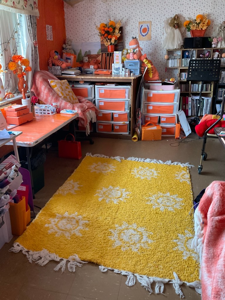 This is an overall view of my orange studio. The rug on the floor has that lovely sun image on it and you can see little bits of just about every part of the room.